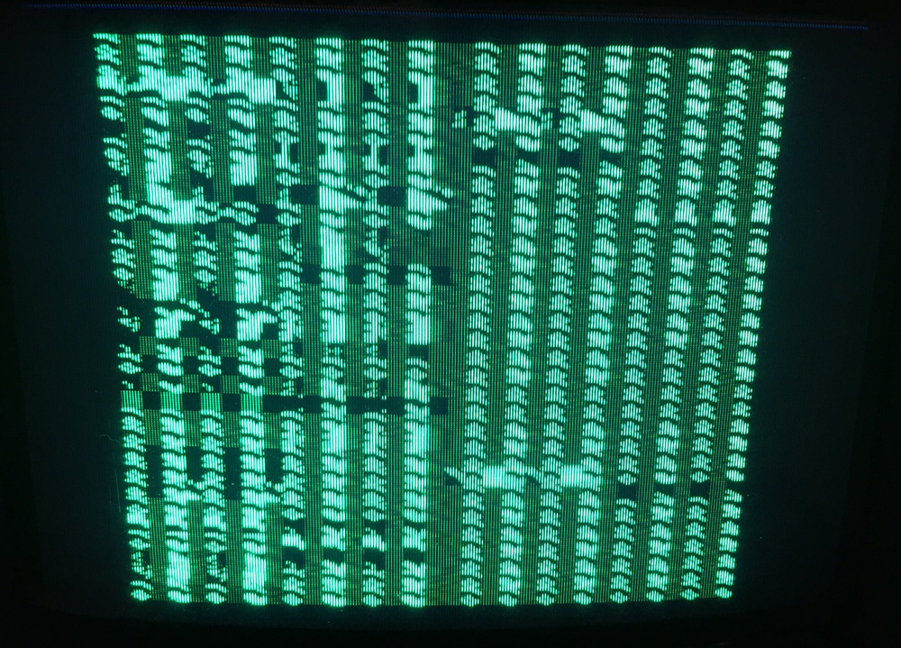 When powered on green garbage was displayed and that’s about it – no signs of life. I tested the main RAM with a logic probe – the address pins were pulsing, as were the write enable and output enable pins, but the data lines remained stuck. That’s a good sign the CPU is trying to do something but the RAM is dead – so I replaced the two chips (64K sram – TMM2063) with another two from a parts board. Now I had some corrupt movement on screen, but it was also consistent corruption on every boot, so I was hopeful the game logic was actually running underneath the corruption.