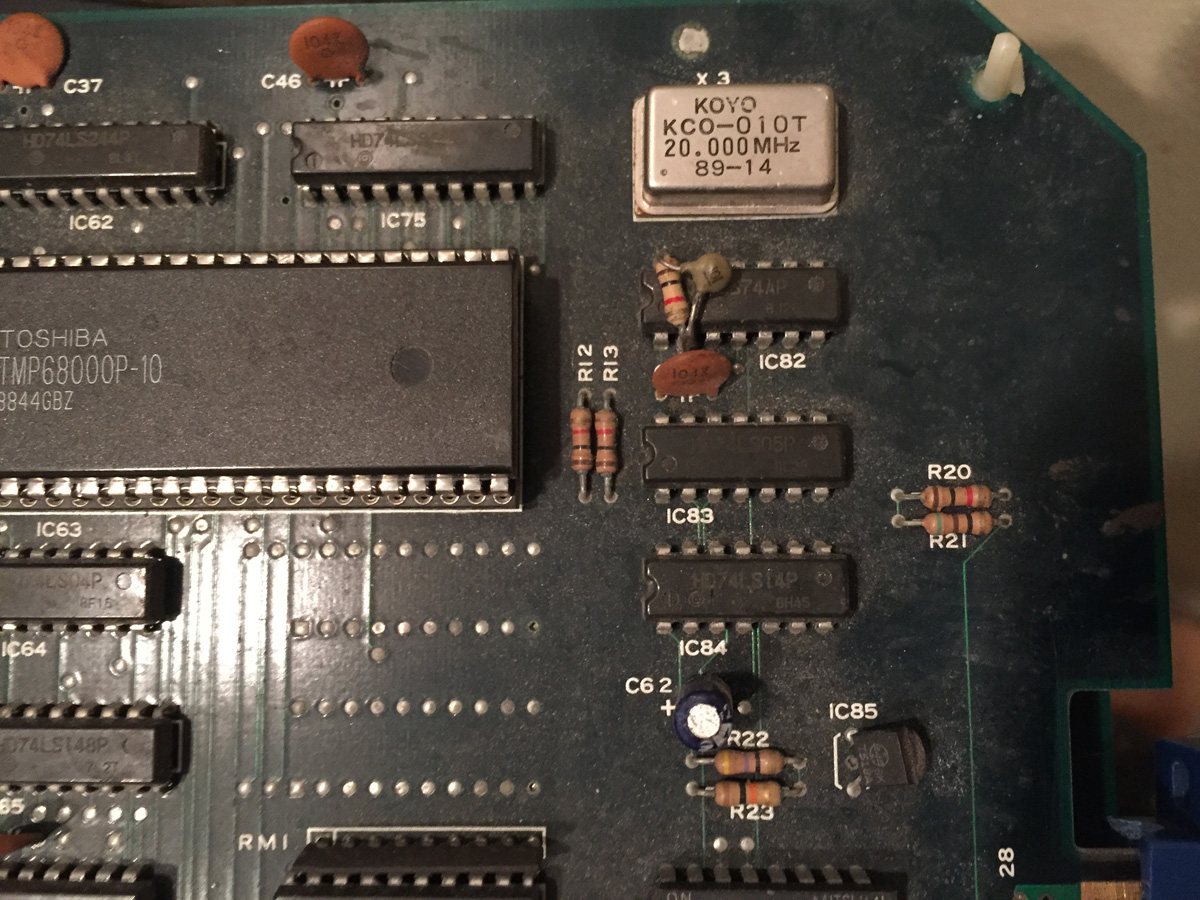 At this point I spent quite a lot of time triple checking all points I’d soldered on the new RAM, then checking for bad pins on the sprite ASIC, or any problems in the TTL that copies between the two spriterams. It’s clear the player sprite was ‘almost’ correct, but had a corrupt layer on top of it. Eventually I unsoldered the large sprite mask ROMs to check if they were corrupt, but the checksums matched the MAME set. When I booted the board with those ROMs missing though, the corrupt bit planes remained and suddenly it was clear what was going on. The output enables for the second set of sprite roms were all stuck on – so whenever the main ROMs were active data from the second set was superimposed on top. The custom sprite ASIC (chip 52) has a 32 bit combined data and address bus. On one cycle it latches the desired address into external TTL, then on the next cycle it activates the sprite ROMs to read 32 bits of data. The TTLs for the lower 16 address bits were fine, but the top 4 bits are controlled by a Fujitsu LS375N which had stuck outputs when tested with the logic probe. This chip was replaced and all sprites were correct.
