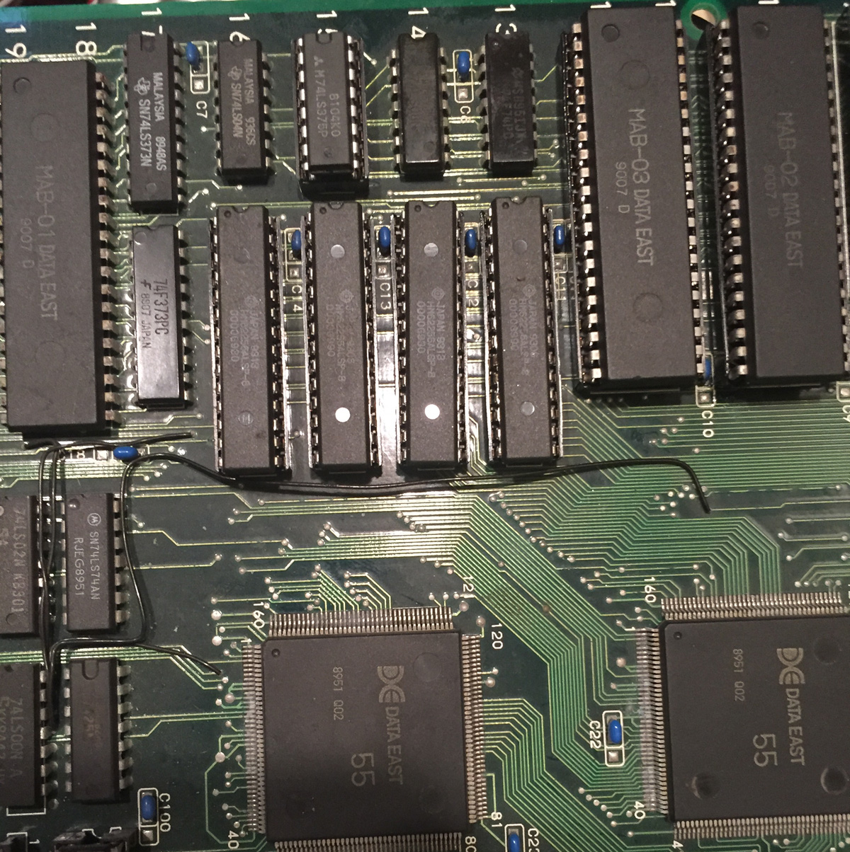 With all the other bad RAM on the board, bad spriteram was likely – many Data East games actually have a setup where there are two copies of spriteram. The main CPU writes to one set, then when complete sets a flag for hardware to copy it to the second set, that the sprite ASIC reads out of. I assume the reason for this design was to avoid contention between the CPU writing and the ASIC reading the same memory. All chips tested bad when removed from the board. When replaced sprites came back, but were obviously corrupt.