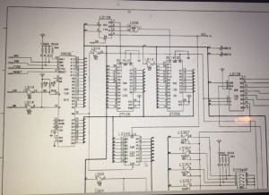 The schematics show the CPU part of the board is pretty simple, so I removed and tested a few chips (Fujitsu LS139 and LS245) but they were ok. Further logic probe tested revealed the LS245 ‘dir’ pin seemed stuck – this comes from R/W pin on the CPU so it seemed the CPU was never writing any data. Even if the CPU was just executing random garbage some writes would be expected. So the CPU (6809E) was desoldered and a socket and replacement installed. The LS245 dir was now pulsing as expected, so it seemed the old CPU has indeed failed internally on that line. Still garbage on screen, but now the garbage consistently changed after a second as if the CPU – maybe it was trying to show the ‘BAD RAM’ screen but if all the RAM truly was bad then that screen itself would be corrupted.