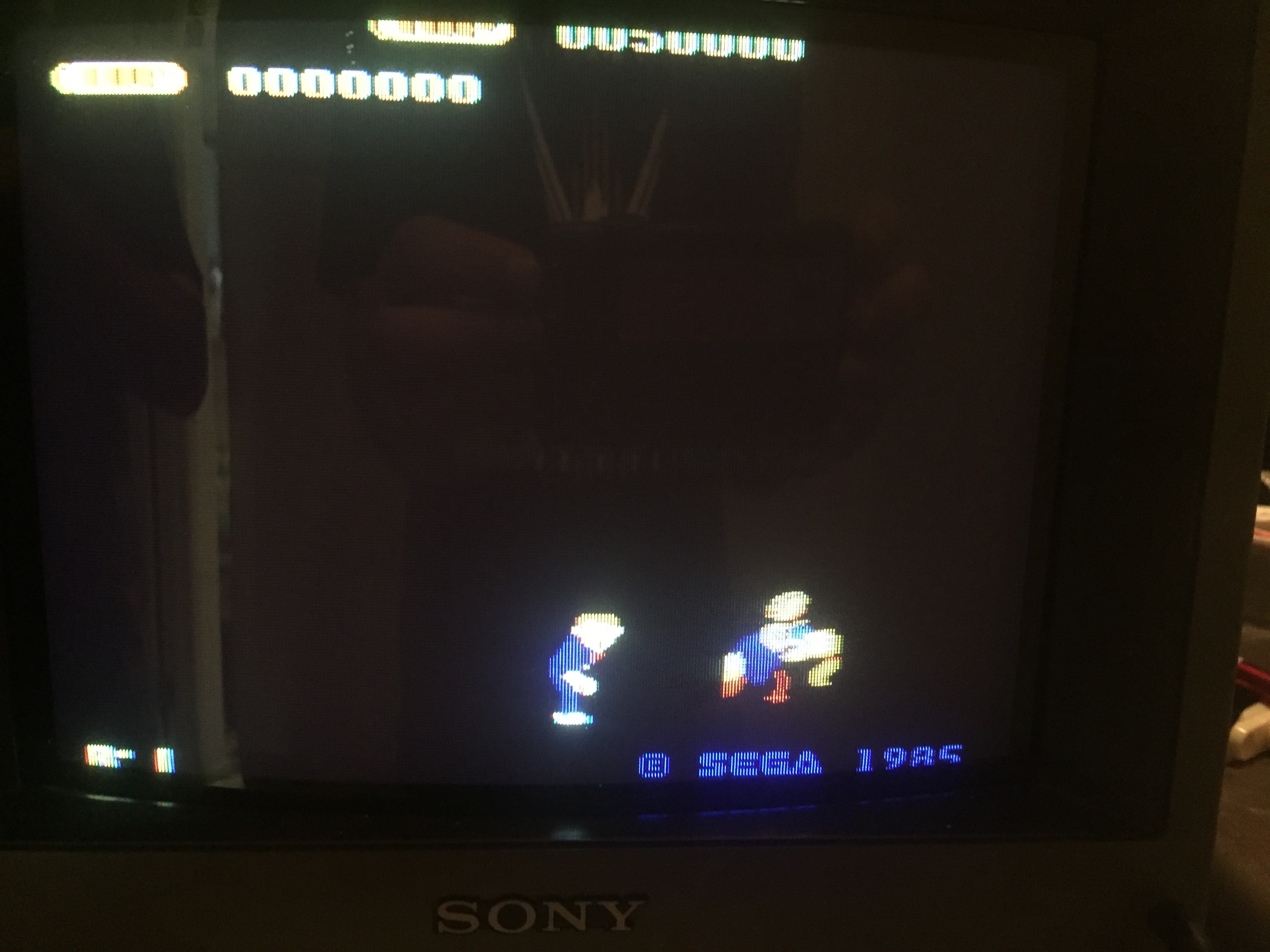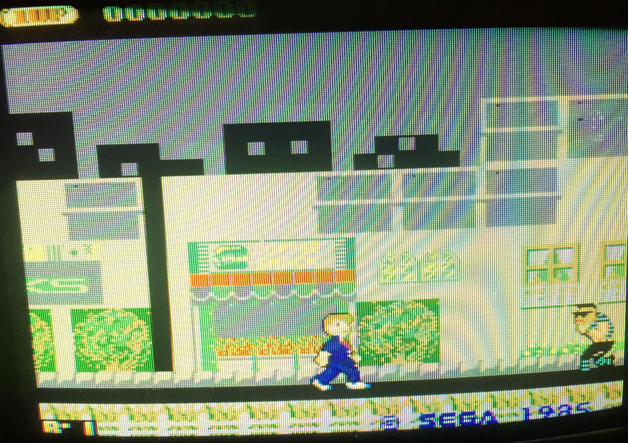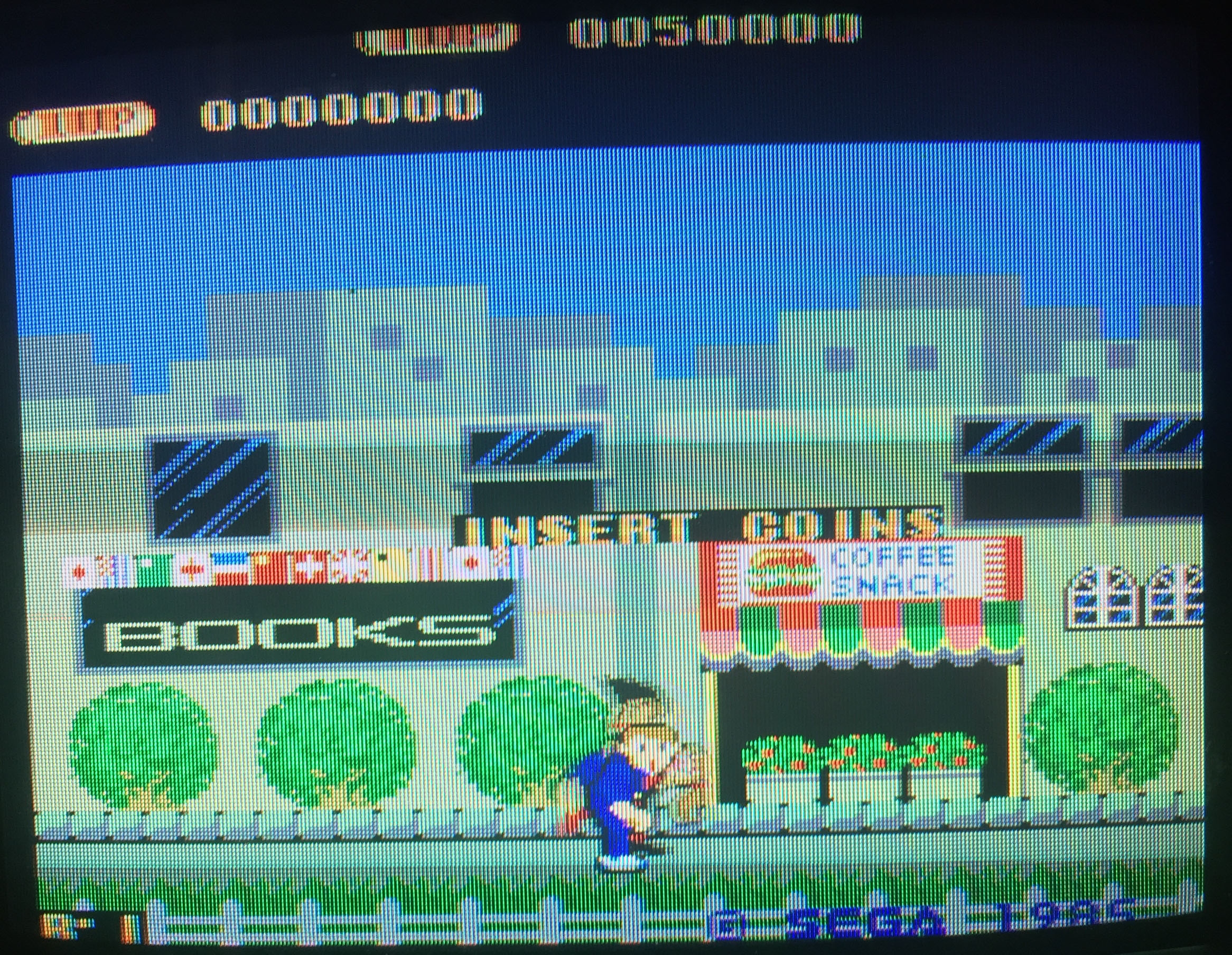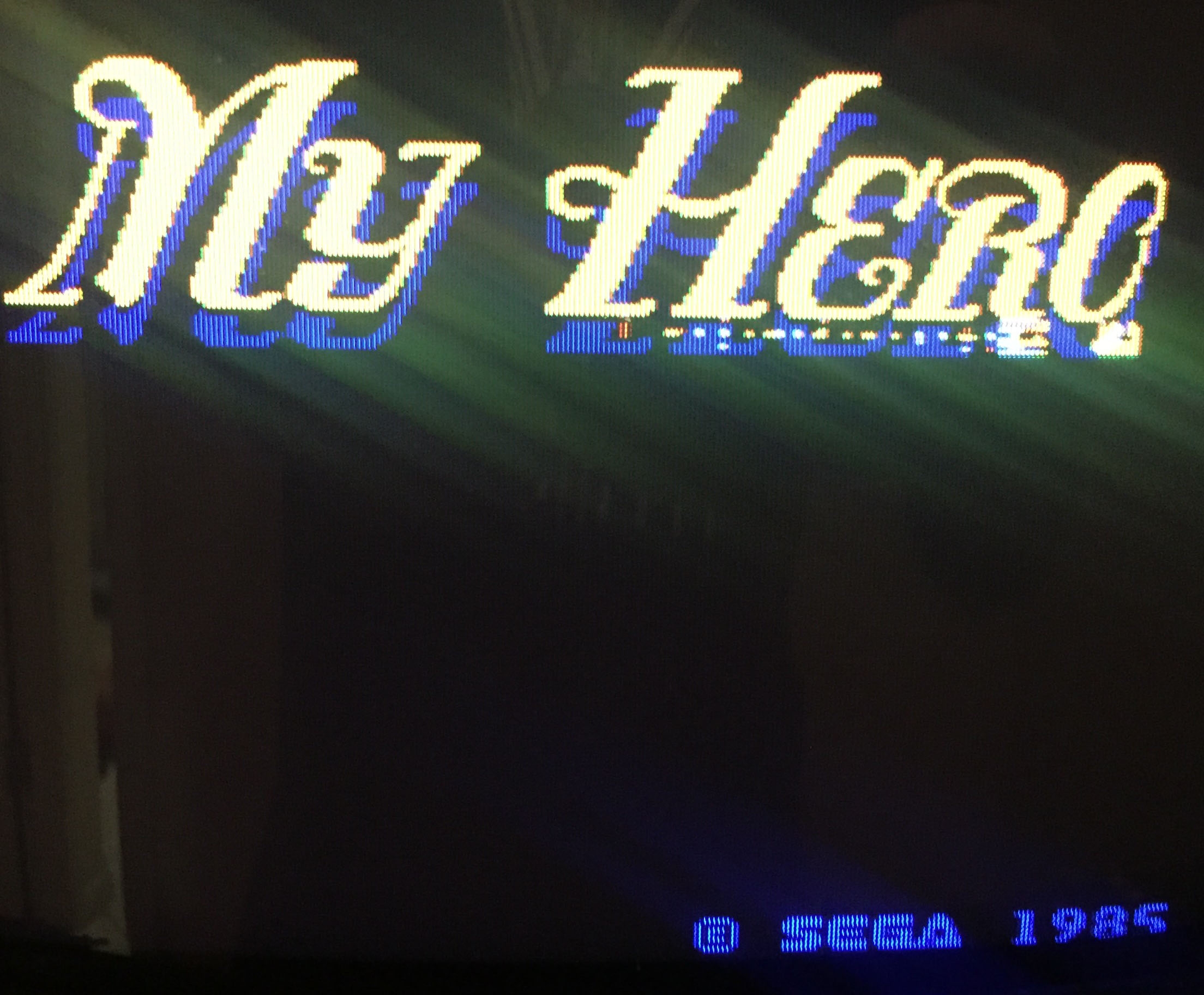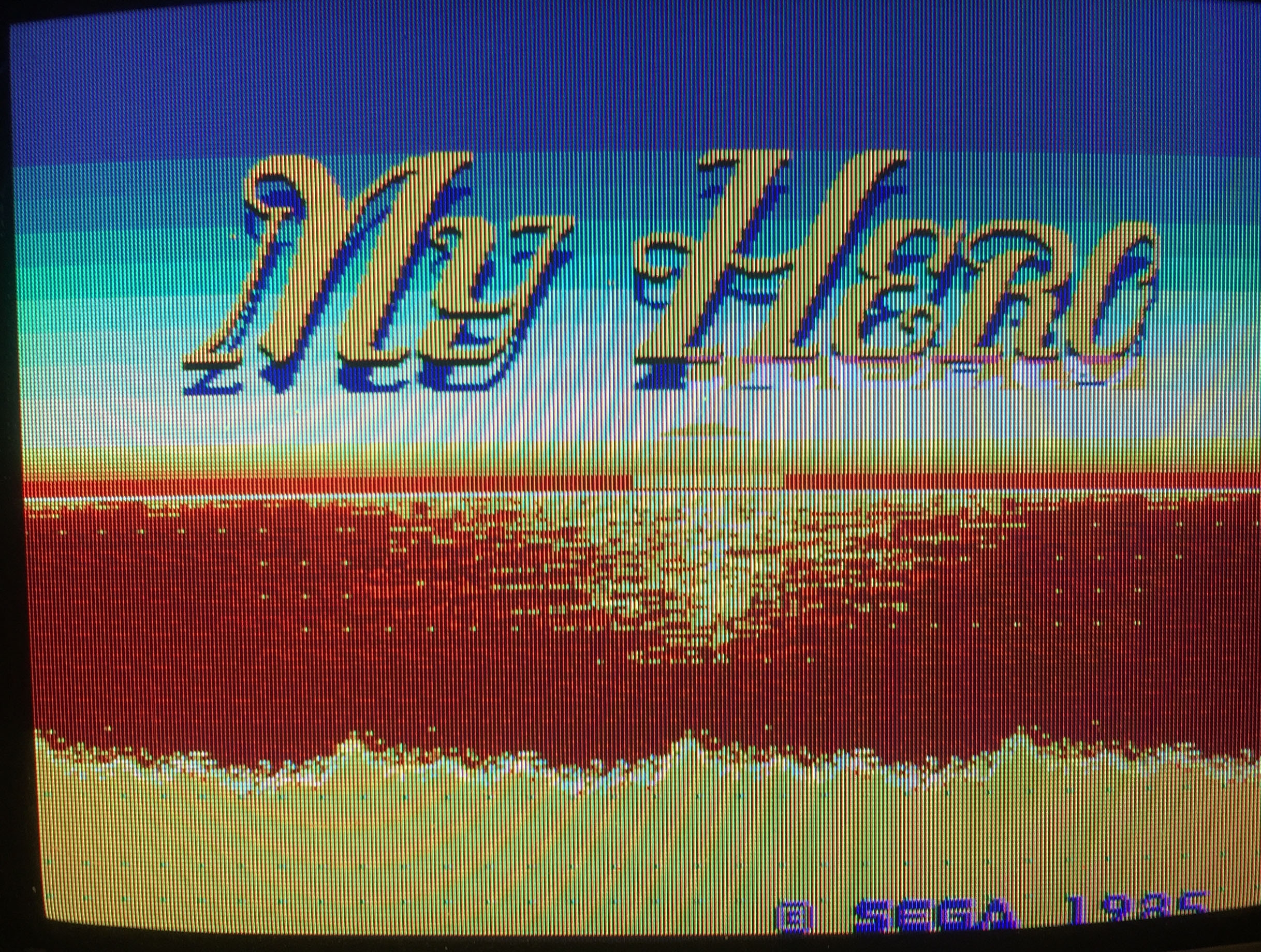 There are no schematics for this game, but the hardware is kind of similar to Choplifter which does have schematics available. The ‘opaque’ test works by just summing the 3 bitplanes for each of sprites and the text layer – all low means it is transparent, any other value means it is ‘opaque’. The priority PROM enforces that opaque text is always over sprites and tiles, and that opaque sprites are always over tiles. On My Hero an LS27 at IC37 handles the opaque check.