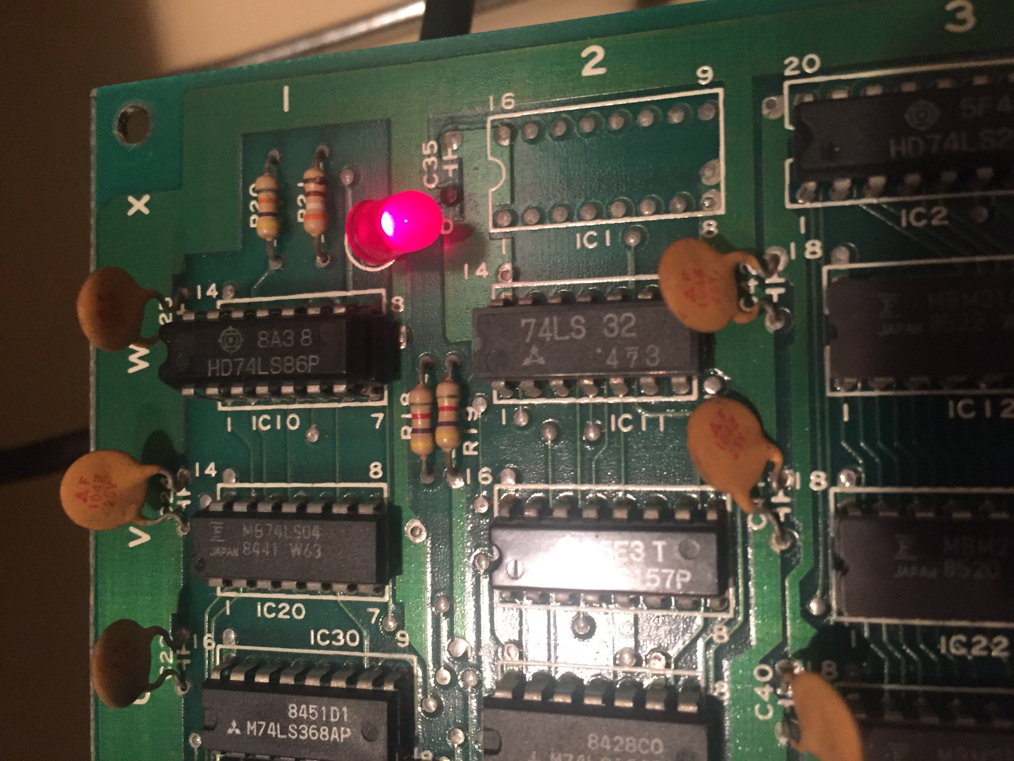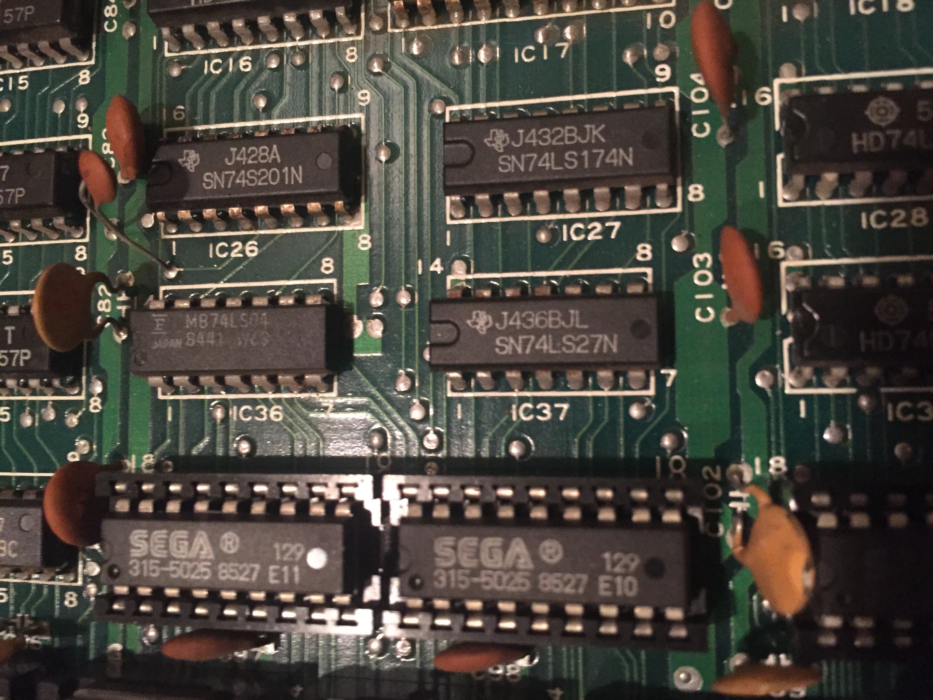 Unfortunately this didn’t seem to be the problem – the priority check seemed correct, and shorting pins on the PROM didn’t bring any backgrounds back either. So I ended up testing each pin on every chip in the tilemap section to see if anything looked wrong. Eventually I found a latch (IC29) with a lot of activity on the inputs but always zero output. The chip itself was fine, the problem was it had no clock input – if I shorted pins to manually clock it, the whole background colour changed – so definitely related to tilemaps. The missing clock traced back to a bad Fujitsu LS86 with dead outputs – when replaced tilemaps fired up. (The latch at IC39 controls the text layer and works from a different clock).