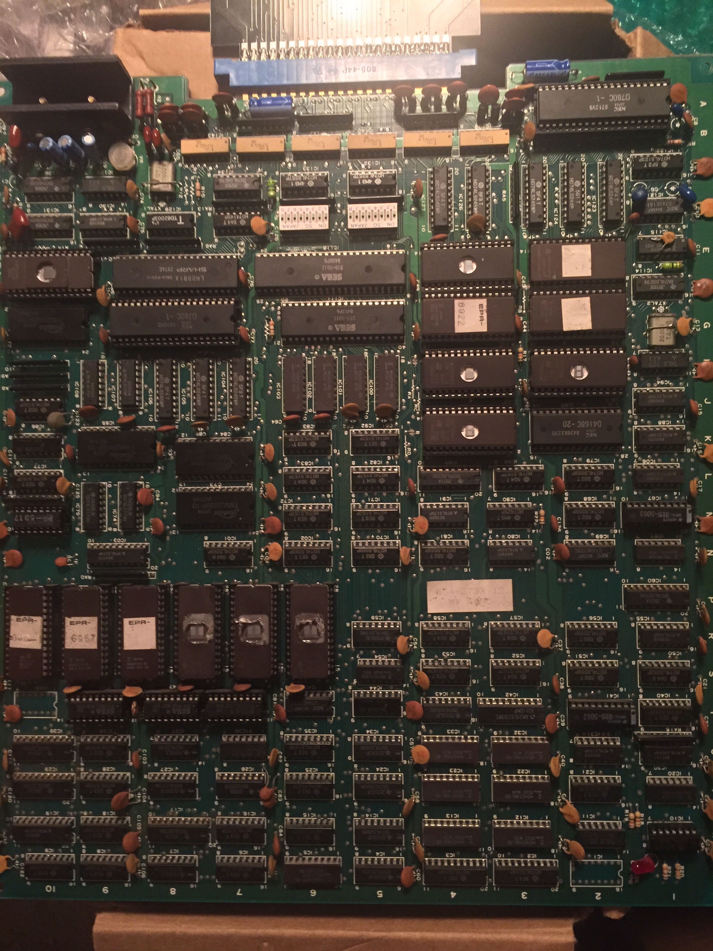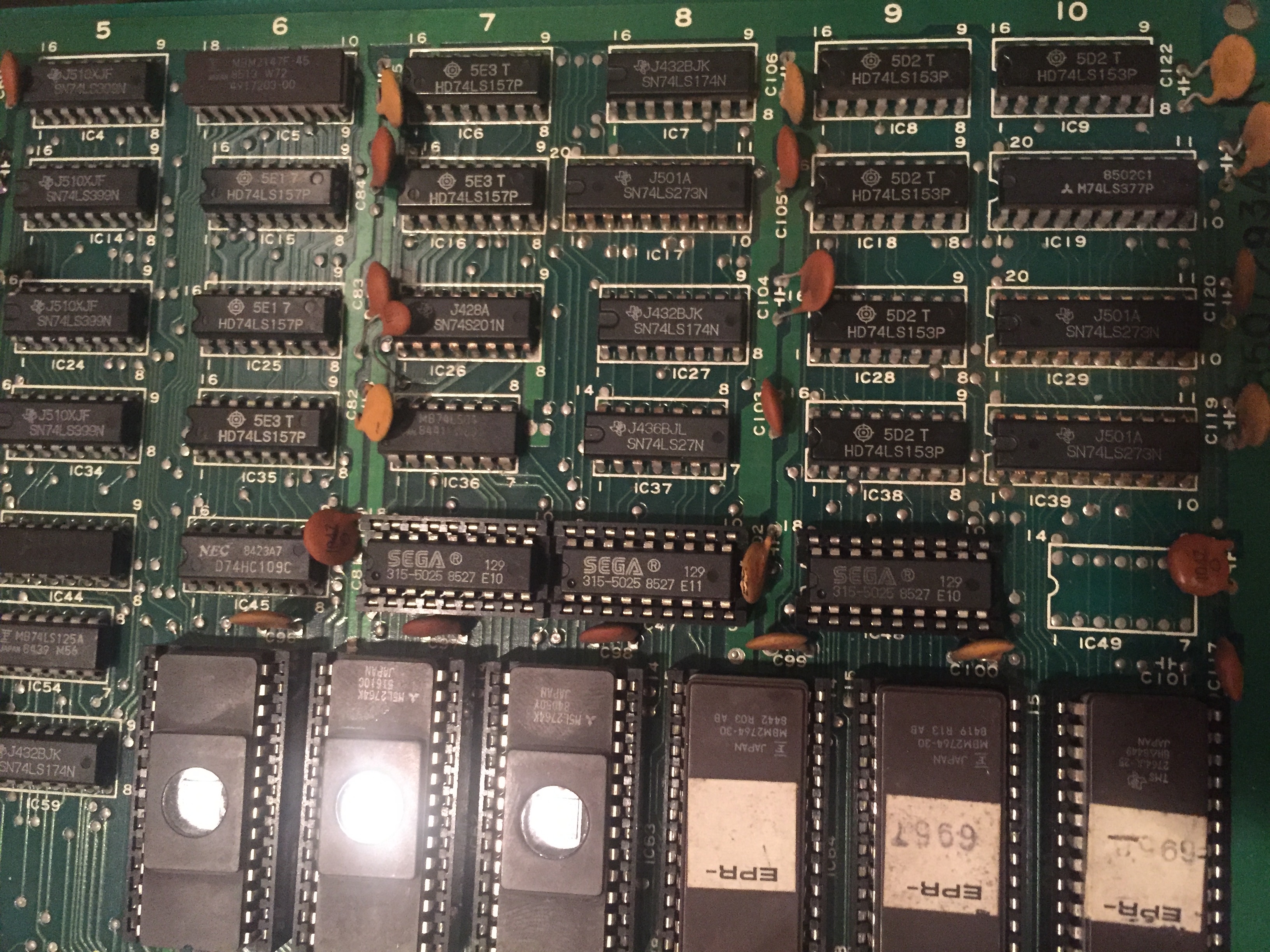 But… bad colours on some but not all tiles and flashing dots in places. This was a headscratcher for quite a while – the ROMs all tested good, the checksums matched, palette RAM was good and no obvious dead or floating lines. Eventually I realised the problem was that 3 of the 6 tilemap ROMs were not original – these replacements had slower access times than the 3 originals left on the board. Although they read fine on the PC reader at slow speed, at the tilemap circuit speed they tended to return bad data or no data causing the bad colours. When replaced with faster access EPROMs, everything was fixed.