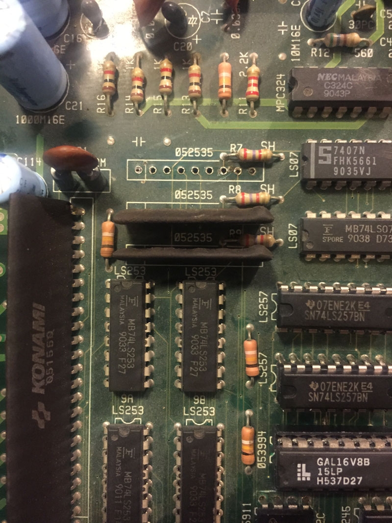 Well, bit of a weird one – the output of the LS32 goes to CN2 (the ribbon cable to the video board) and that pin had continuity to ground with the cable connected. So bad video board? Nope, bad cable – a ‘PC’ style IDE cable was used rather than the Irem original and the pins are actually inverted (so the top row went to the bottom row) and this just happened to ground out that LS32. Of course a whole lot of other pins were connected in the wrong way too – so quite lucky it displayed anything. Original Irem cables were taken from a parts board and the game worked fine.