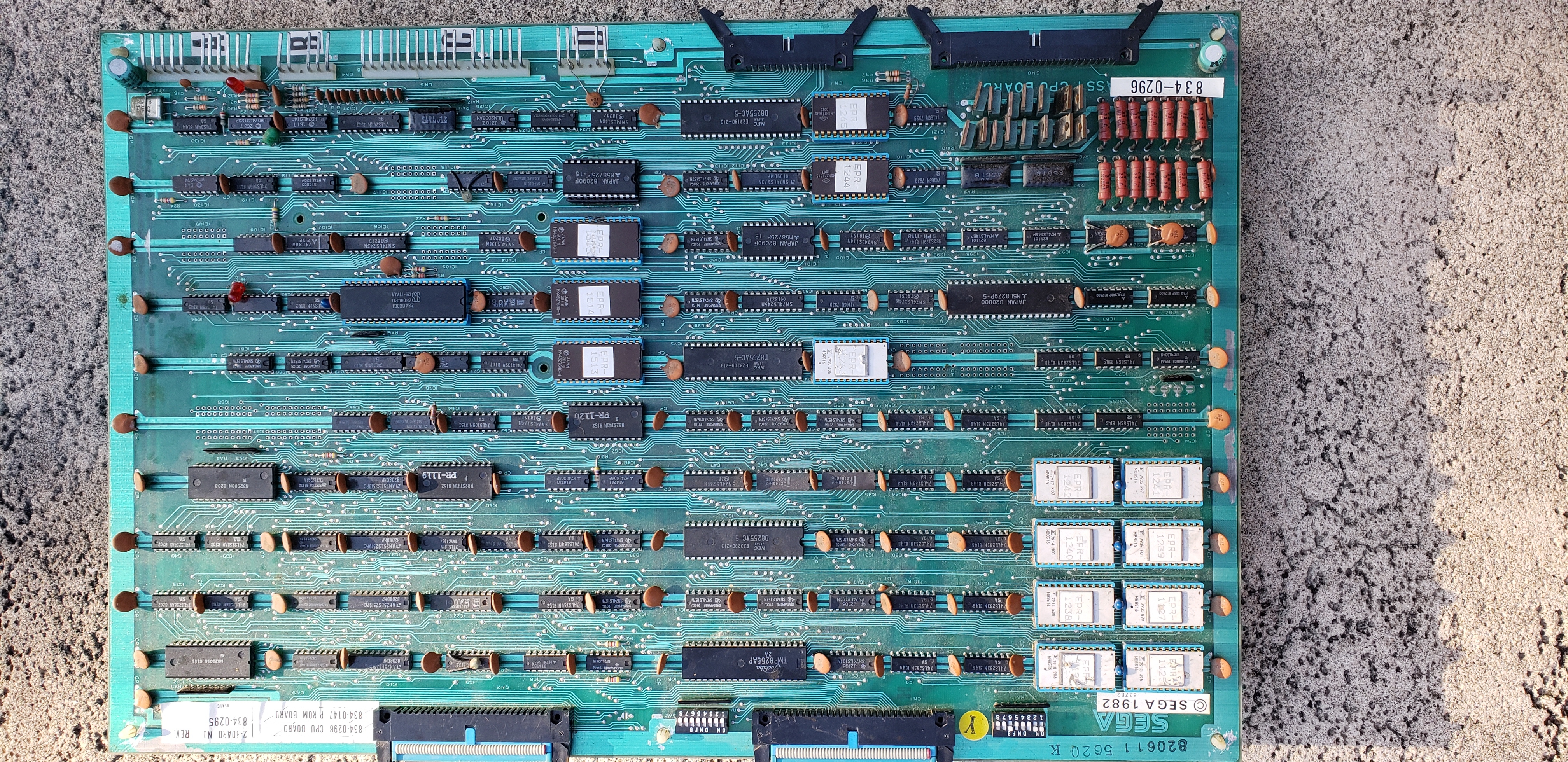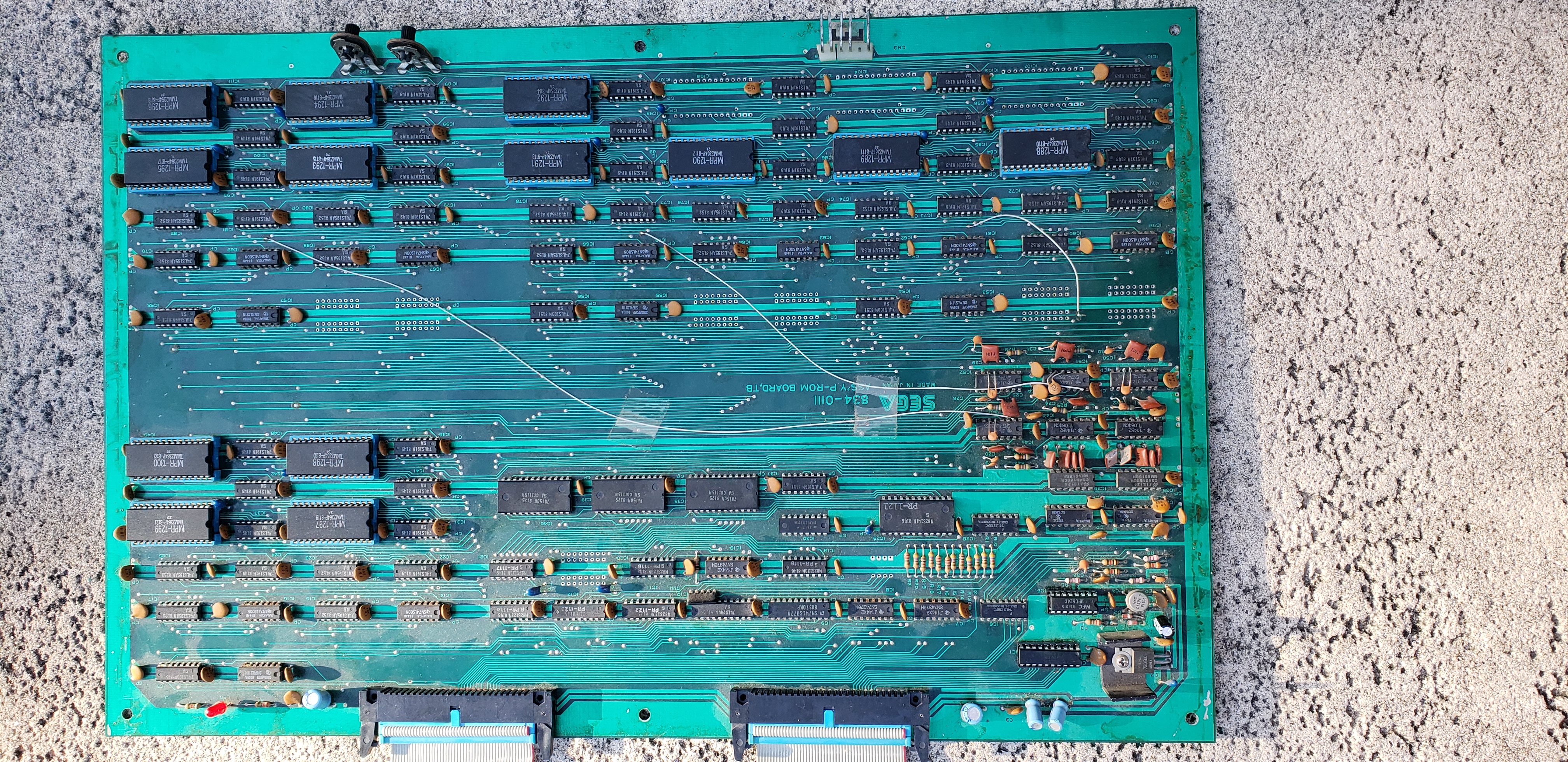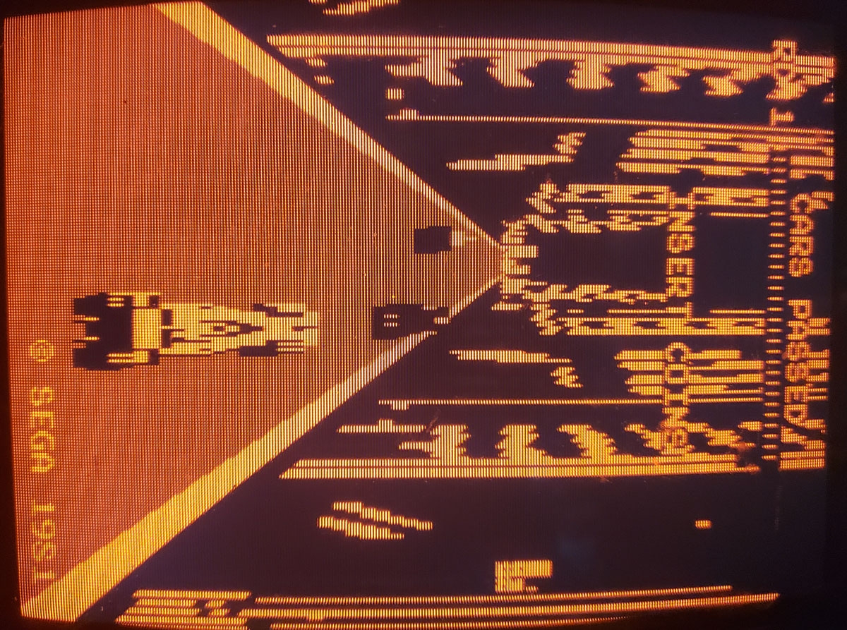 Sega Turbo is quite a complex pcb, certainly very complex for 1981, and also a bit of pain to repair. The video output isn’t compatible with my usual Sony PVM test monitor (hence the red only display), but also it requires -12V as well as +12V which not all modern PSUs supply. The problem with this board is stretched sprites – in fact all sprites are stretched to their maximum value.