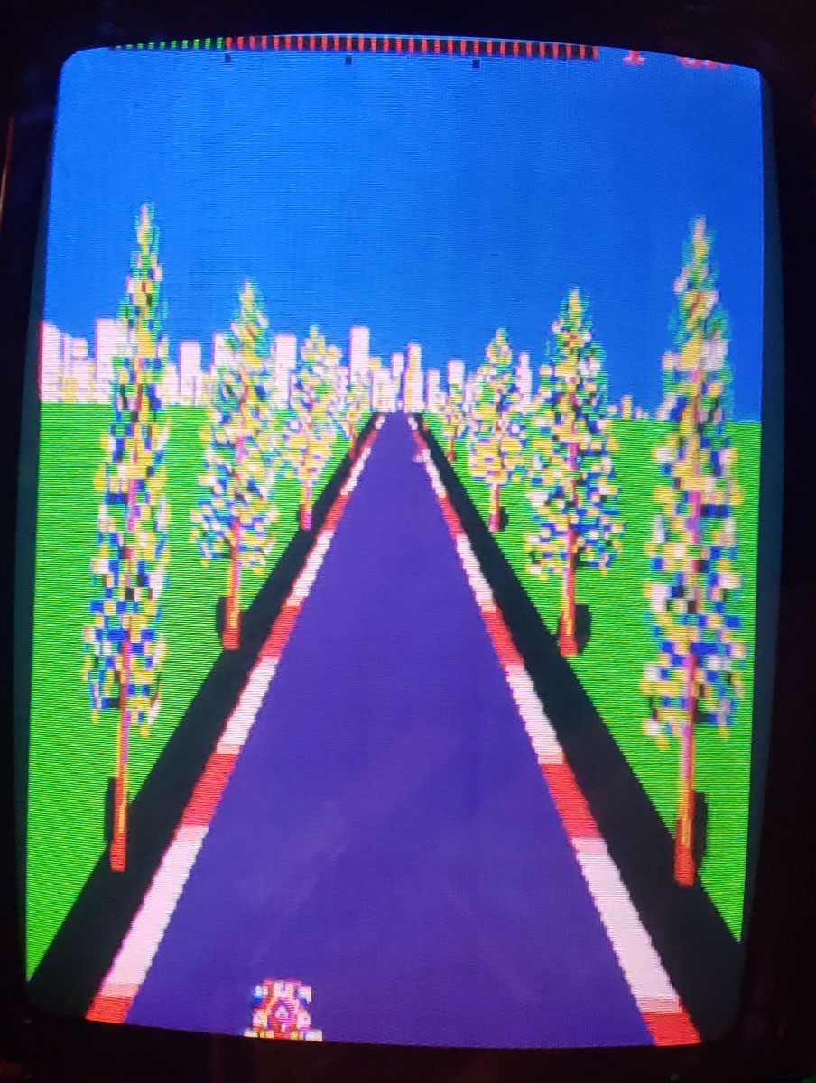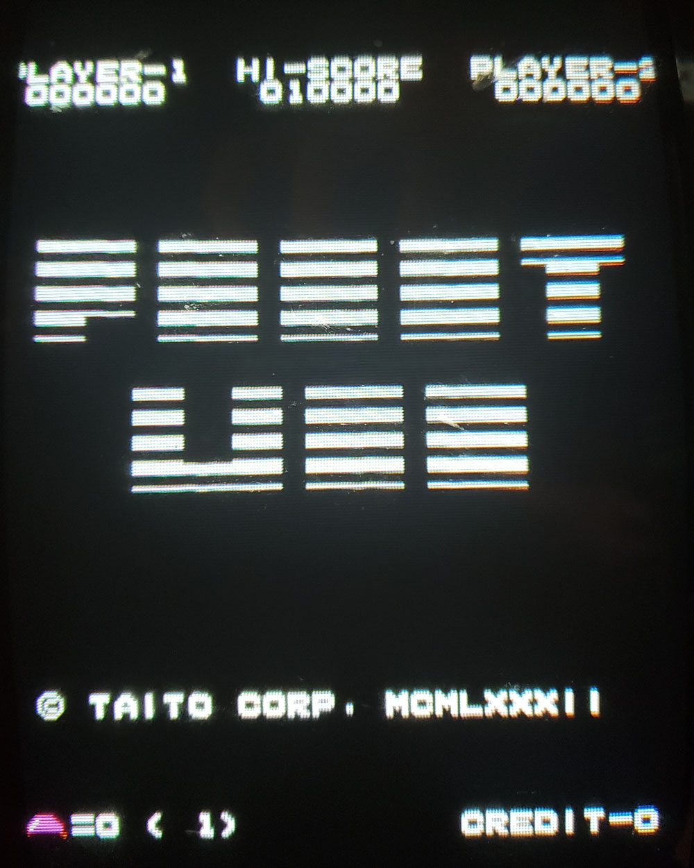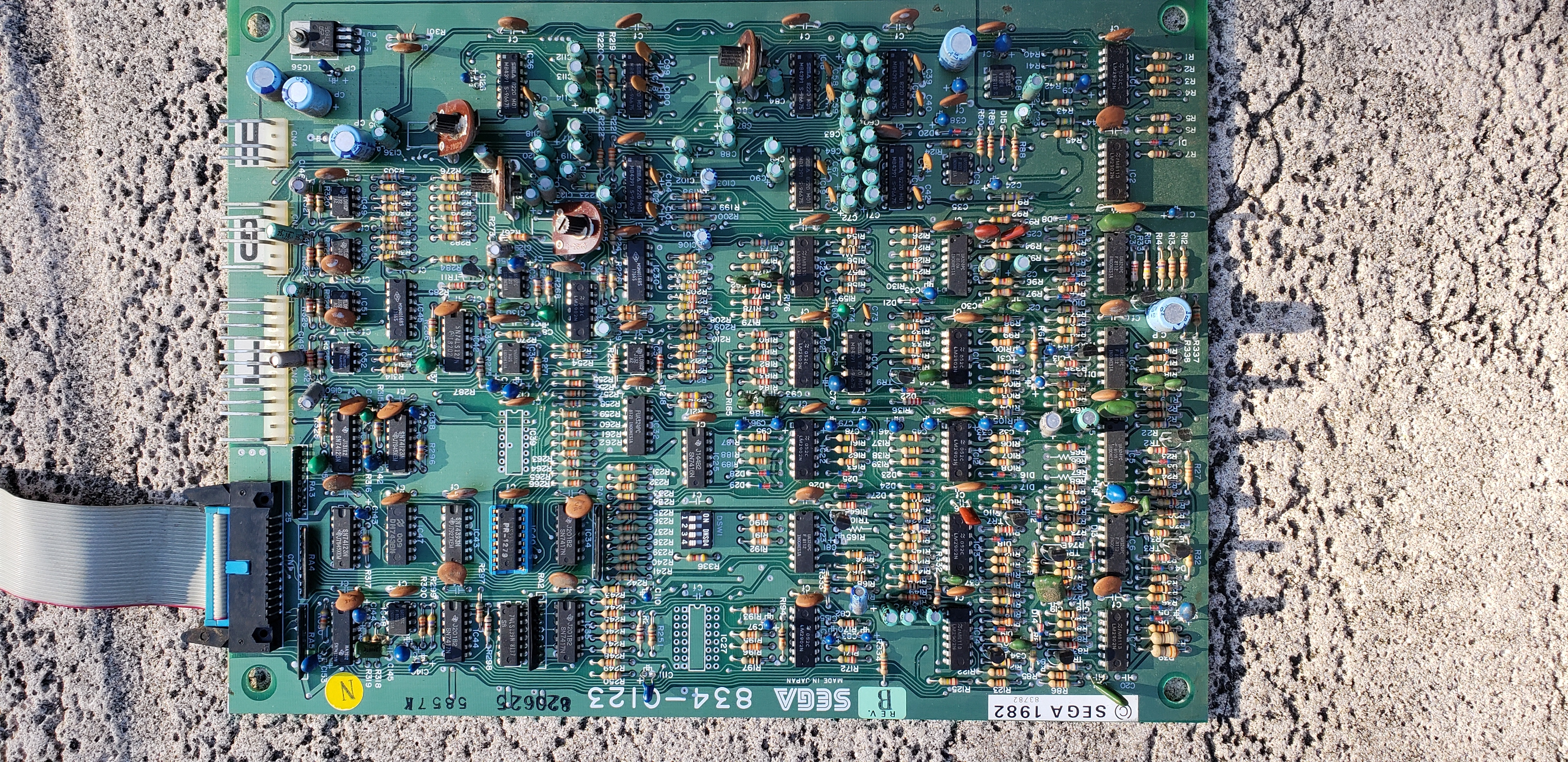 Sega Turbo is quite a complex pcb, certainly very complex for 1981, and also a bit of pain to repair. The video output isn’t compatible with my usual Sony PVM test monitor (hence the red only display), but also it requires -12V as well as +12V which not all modern PSUs supply. The problem with this board is stretched sprites – in fact all sprites are stretched to their maximum value.