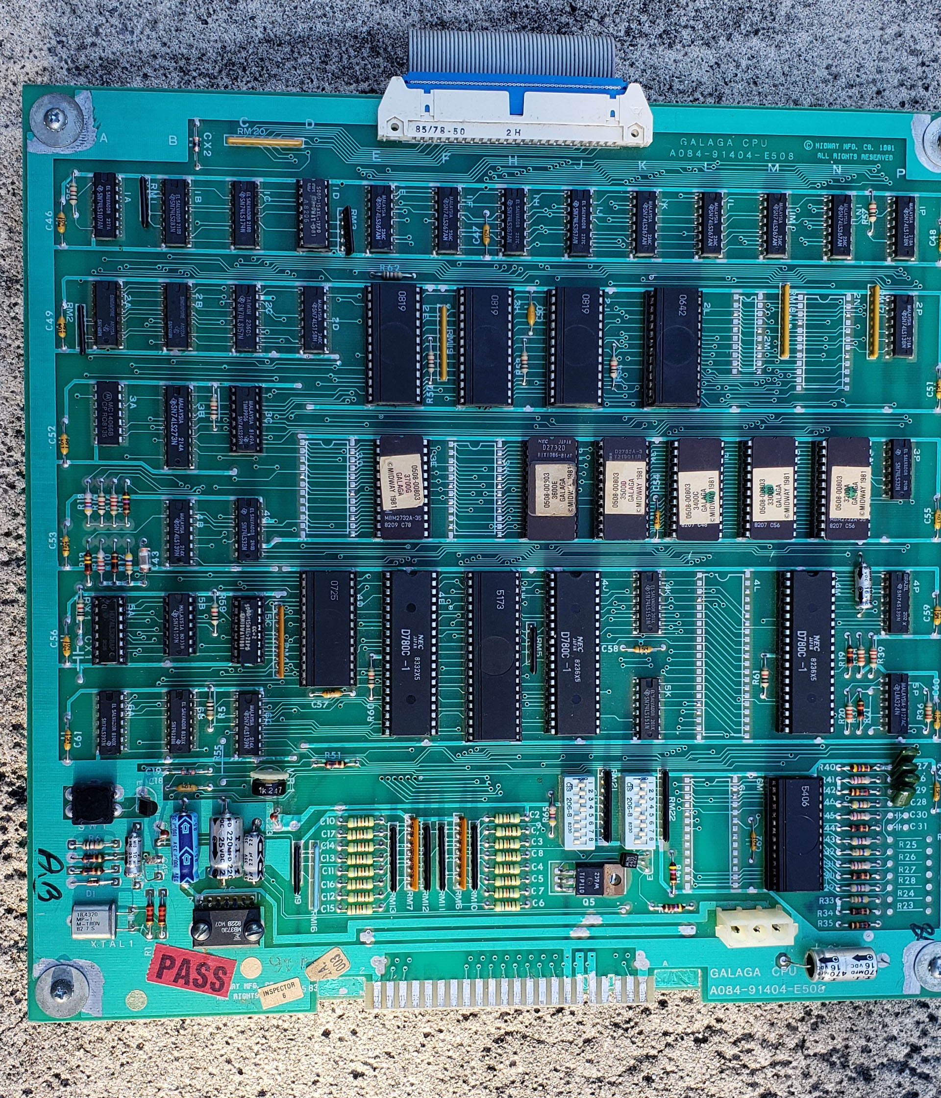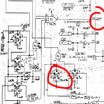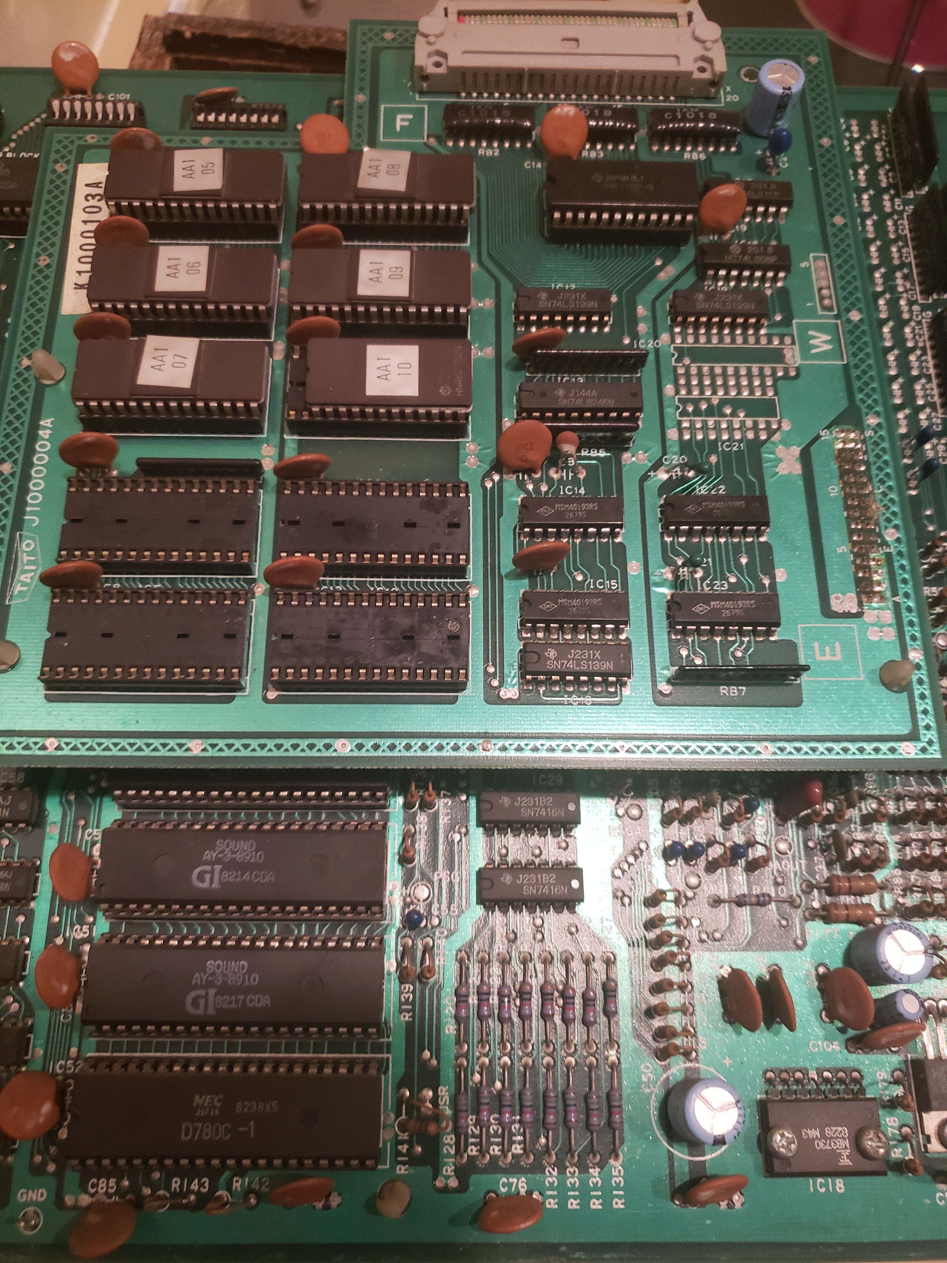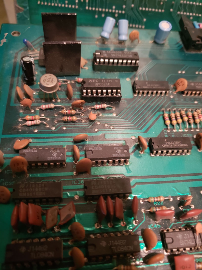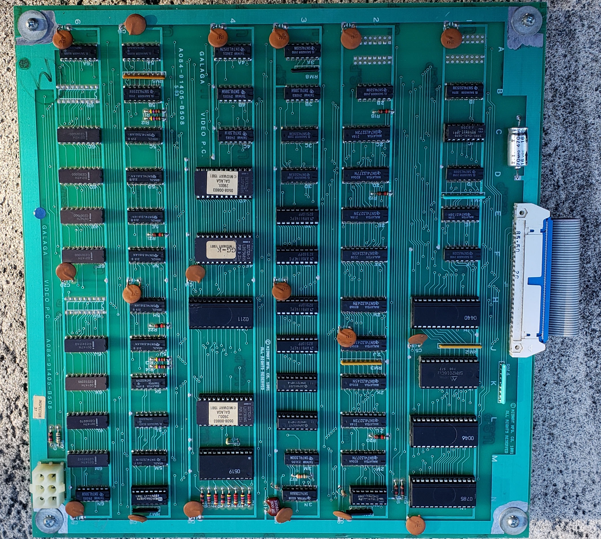 The current scale value is held in the LS373 at IC1 on the video board – the drives a digital to analog convertor – UPC624D which then drives a UPC159. Notice how the two analog components require -12V – without that the sprite clock will not run at all and there will be no sprites on screen. If the LS373 fails with all outputs high the board will display the maximum scale, likewise if the UPC624D fails with high output you get the same effect as both cases lead to the UPC159 getting maximum voltage. On this board the UPC624D had failed and was replaced to fix the problem.