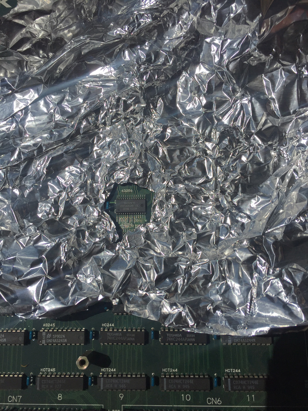 If you don’t have a SMT desolder station then (if you dare) you can remove surface mount chips with a heat-gun and some tinfoil to protect the surrounding areas. The chips are capable of taking quite a lot of heat so the only worry is warping the board rather than damaging a chip. Because there’s very little solder holding the SMT chips on though, they come off quite easily.