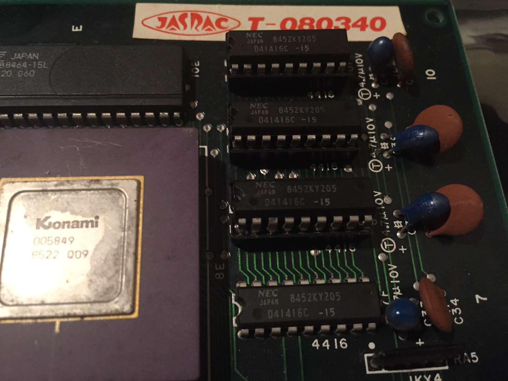 This pcb was in clean shape but sprites were corrupt. It’s not very clear on the picture but it seemed every second column on the screen was missing, so was more likely to be in the sprite processing area than the ROMs (if it were the ROMs the missing lines would move around).