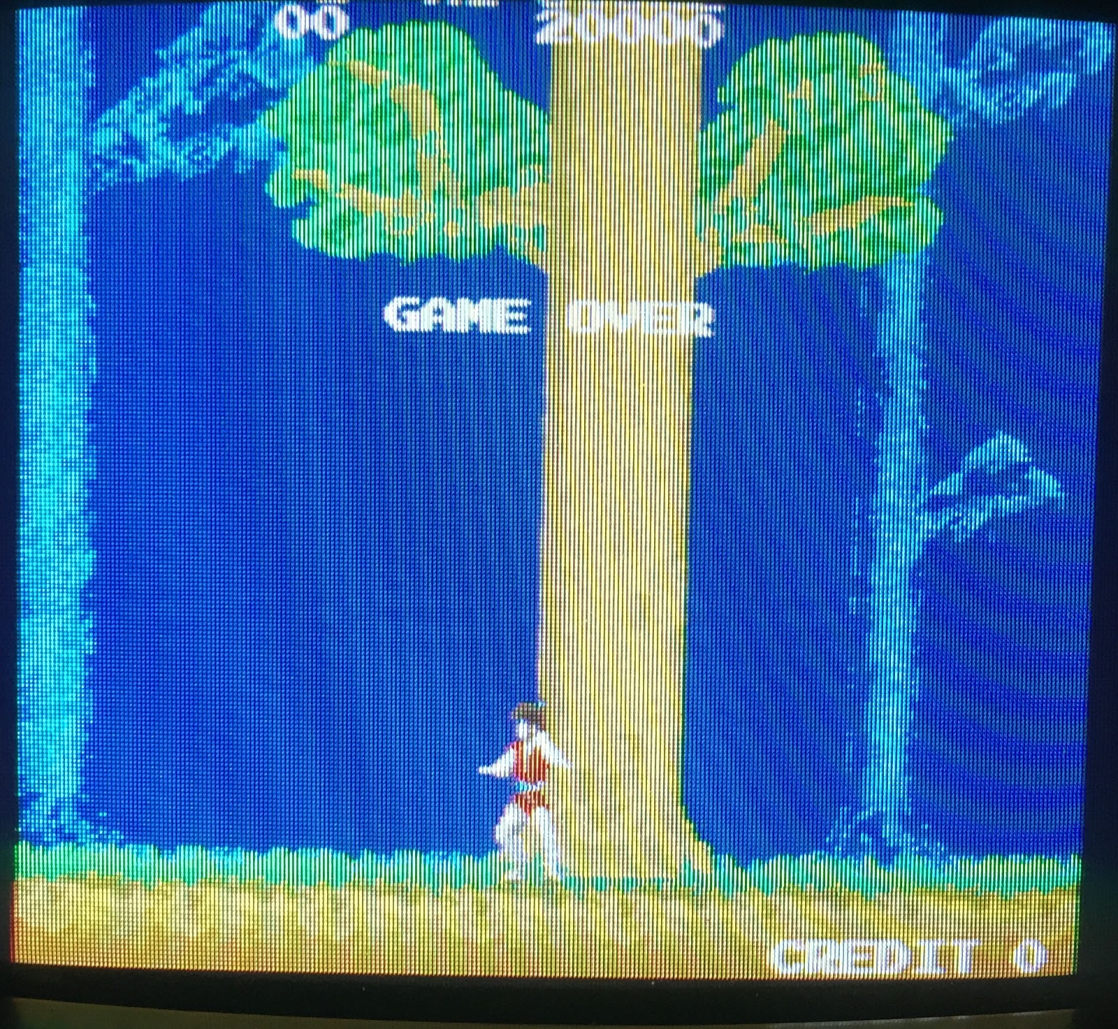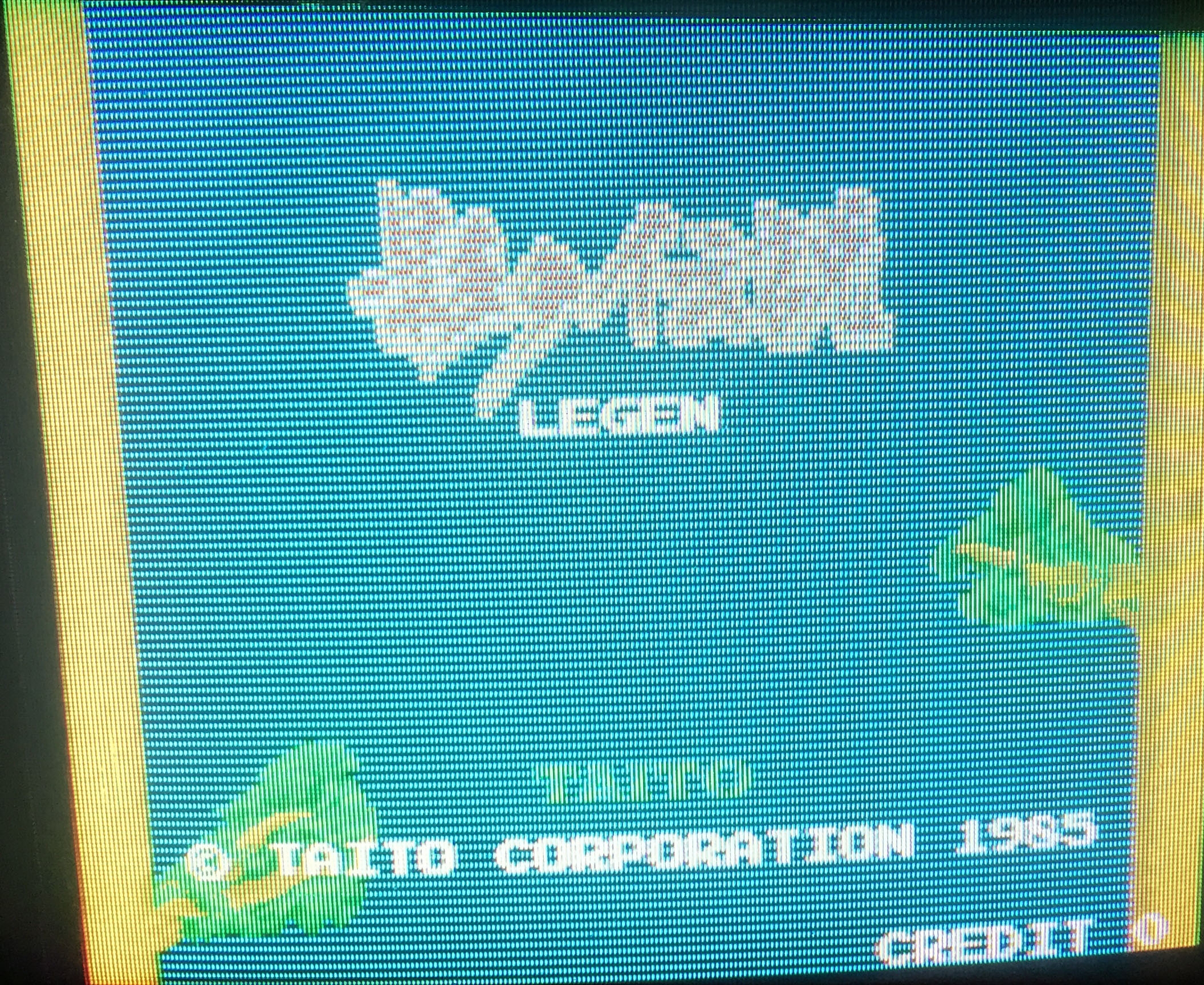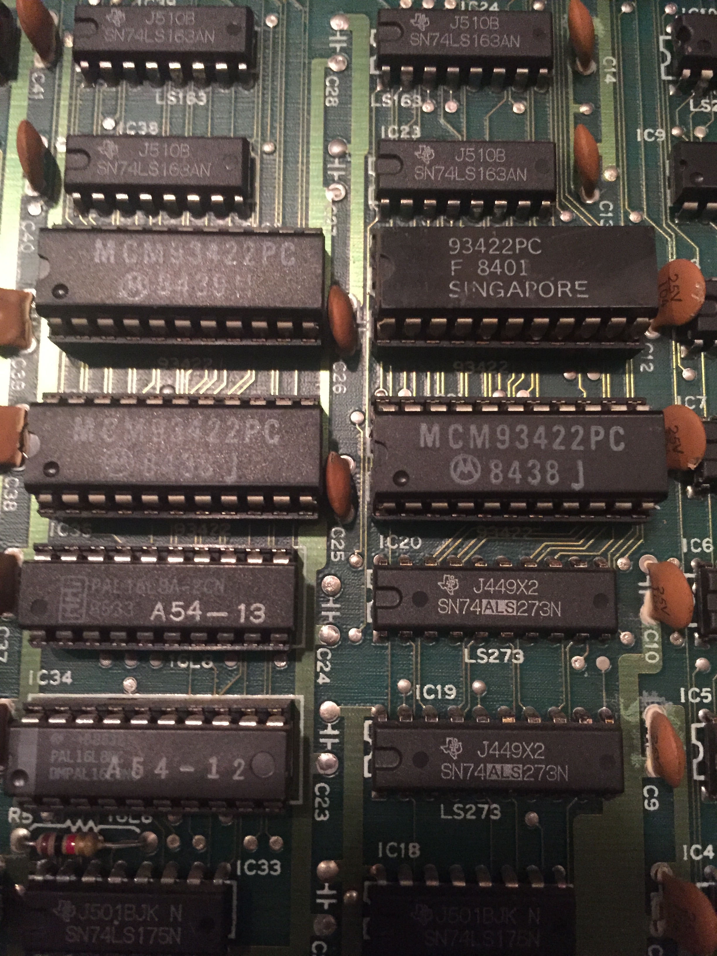 Much like the earlier Tiger Road repair every other line missing in the sprites suggests a double buffered sprite line buffer system, and that one of the buffers have failed. Handily the sprite ROMs were in sockets already on this board, so I removed them one at a time and booted the board – removing all except IC21 caused additional visual faults, so good chance this was the culprit.