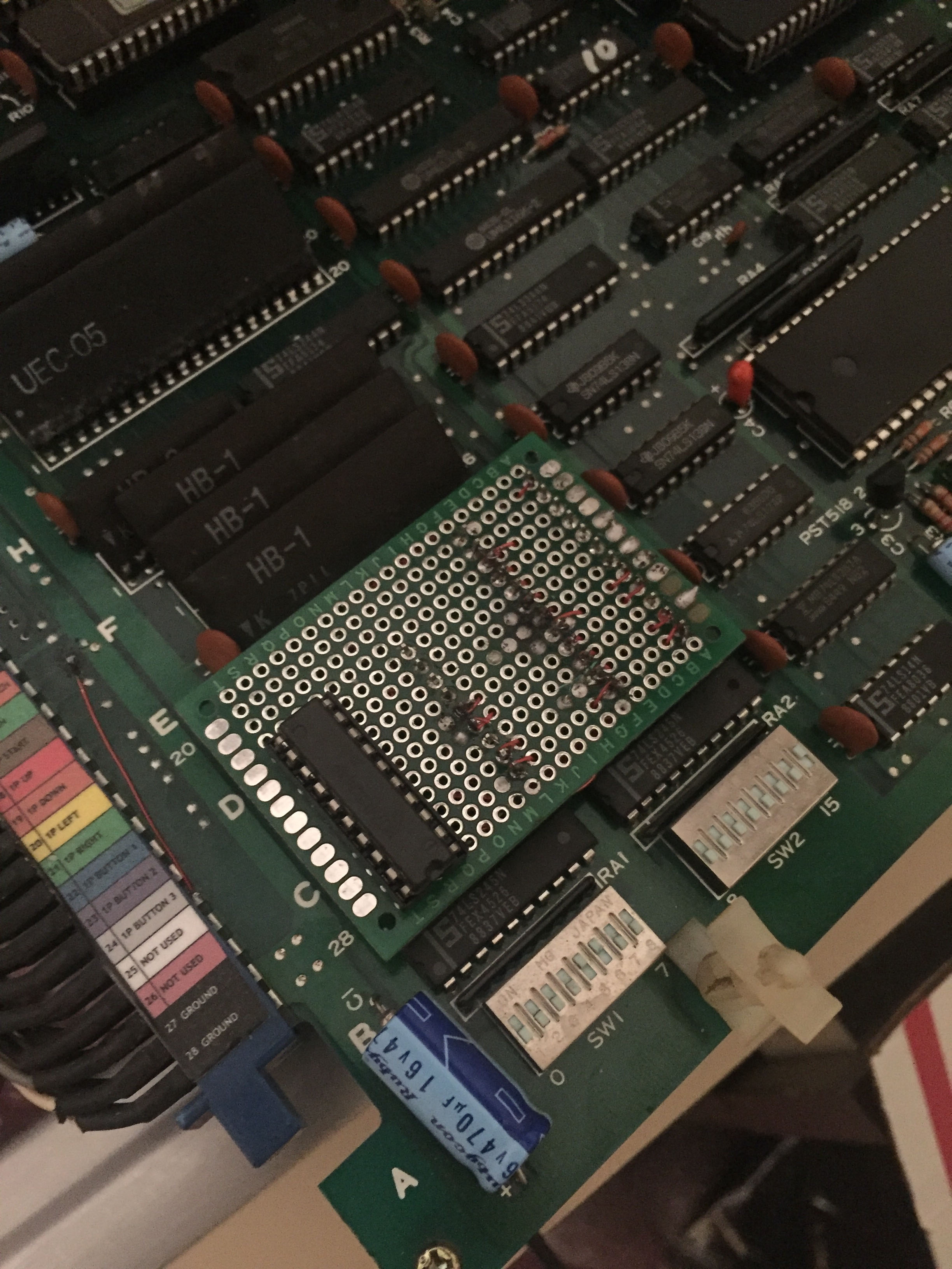 The entire top board is for sprite processing and contains 12 ram chips (the tilemap, palette and main RAM is all on the bottom board). The bad chip was found by piggy backing a known good RAM chip on top of each RAM until the problem went away.