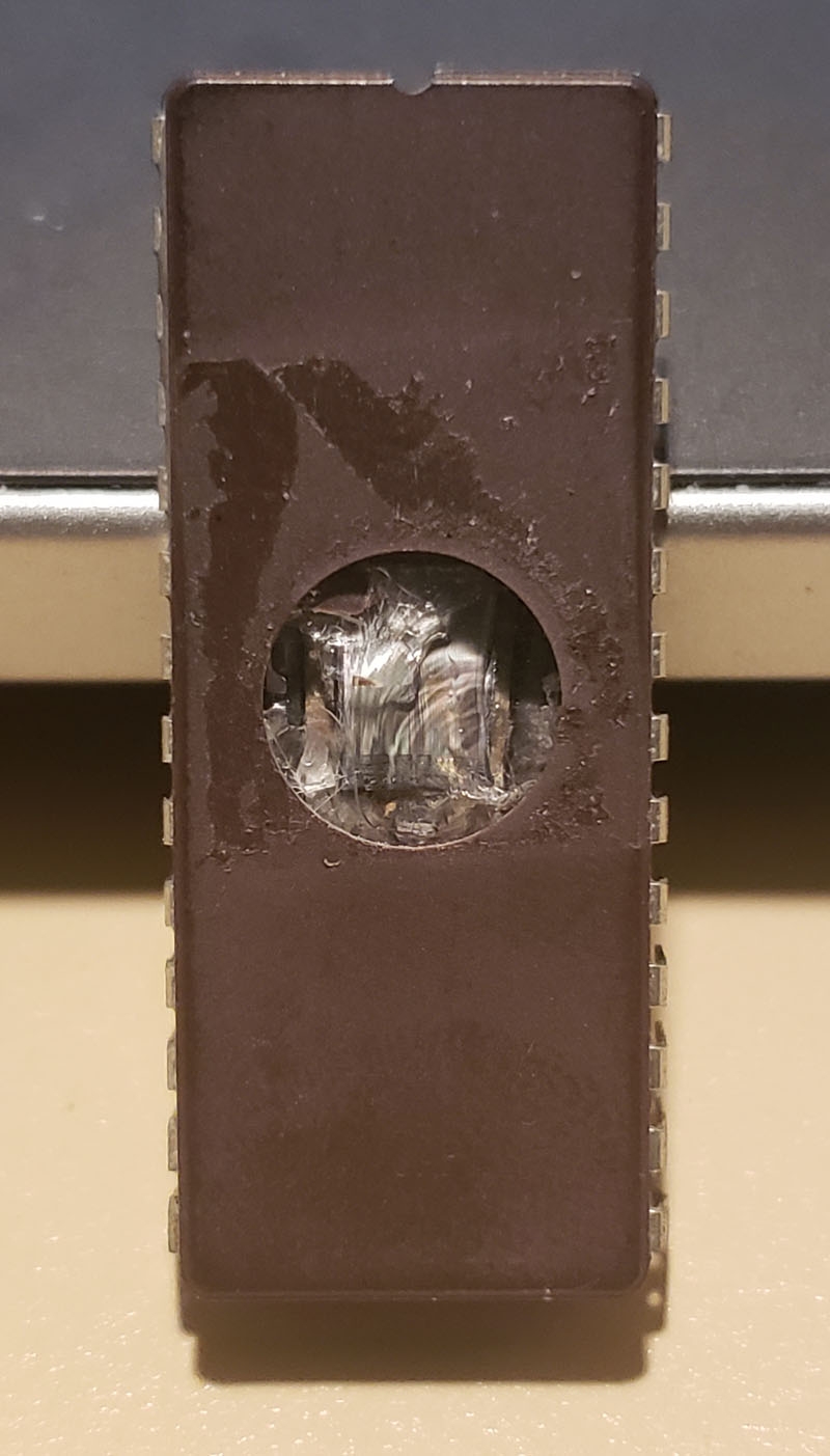 As most of the sprites were correct I suspected the eproms – there are 3 pairs and a failure of any pair would affect some sprites but not others. Eprom 16 was indeed bad, and sprites were fixed when I burned a replacement. Underneath the sticker the reason for the failure was obvious – some kind of physical impact had smashed the die.