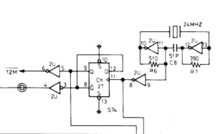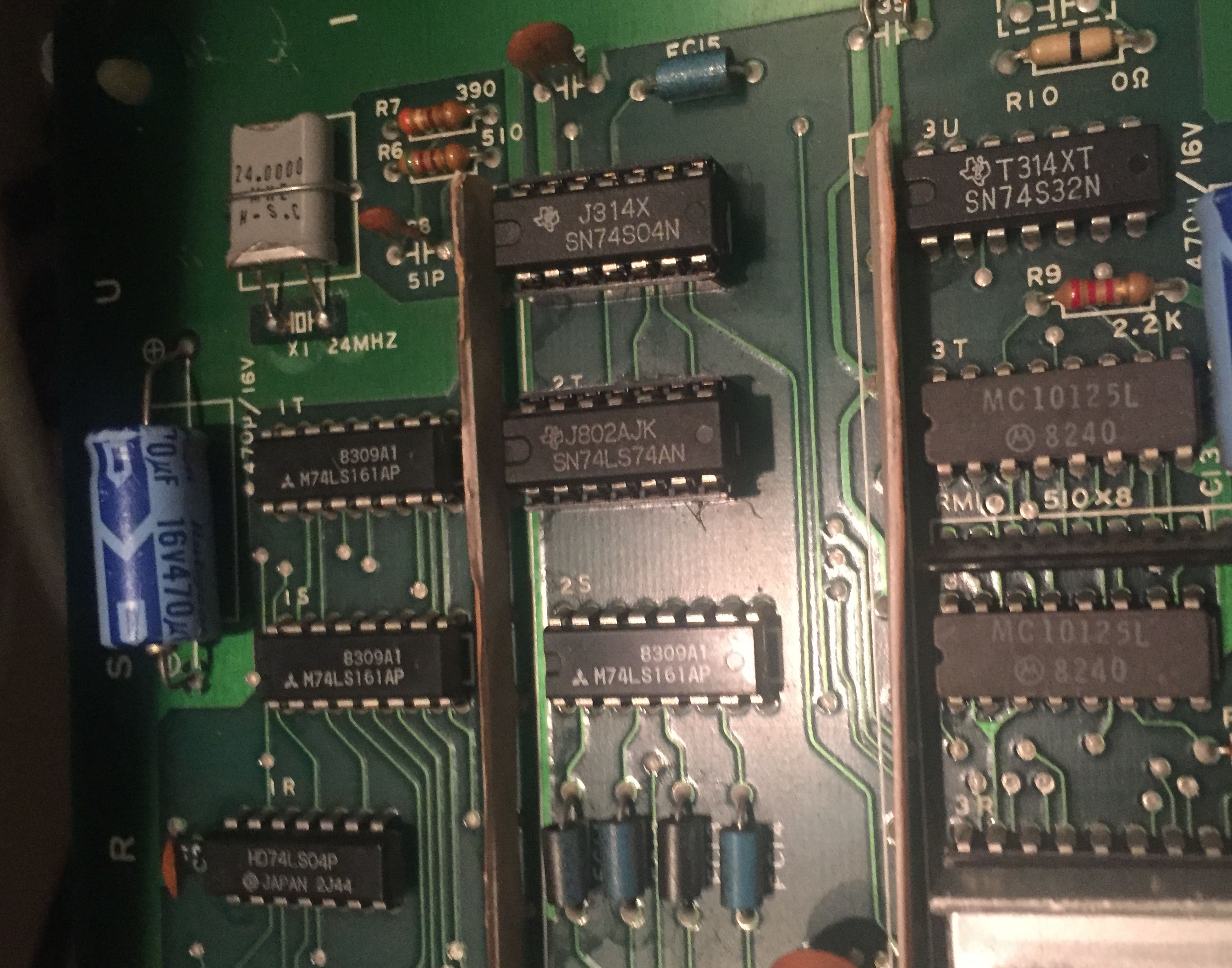 The sync signal is mostly produced by a couple of LS123 chips – there was no output from them – but also no input to them either. I followed the path upstream until getting to the clock circuit, so much like the Popeye repair the video clock circuit didn’t seem to be active.